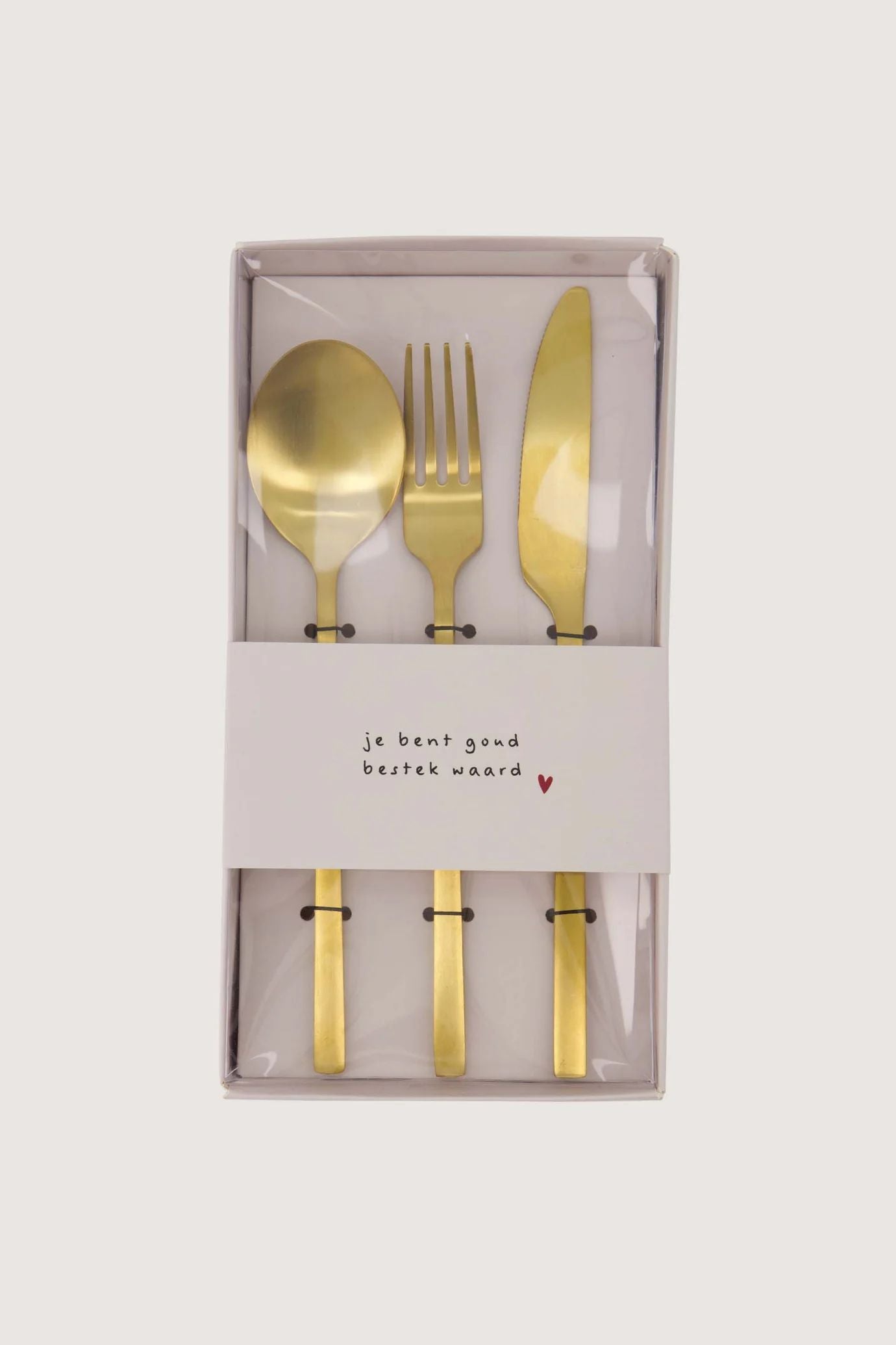 Kijk eens hoe leuk. Een 3-delige bestekset van Zusss! In deze set zitten een gouden mes, lepel en vork. De items zijn 21,5 cm lang. Een leuk detail is het zwarte hartje onderaan het bestek. Ook erg leuk om weg te geven! De items zijn gemaakt van metaal.